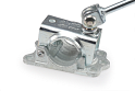 Prakticky rozmístěné otvory v litinové základně držáku umožňují montáž dvěma, třemi nebo čtyřmi šrouby M10. Překlápěcí klička umožňuje dotažení držáku i v místech s nedostatkem místa. Určeno pro opěrná kolečka a opěrné nohy s průměrem trubky 48 mm. Max. zatižitelnost 300 kg staticky.