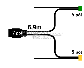 - Ze sedmipólové zástrčky jsou vyvedeny dvě větve pětižilových kabelů 5x0,75 mm² (levá a pravá) o délce 6900 mm.