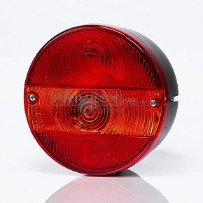 Zadní sdružená svítilna Fristom MD-16 s funkcí brzdové, obrysové a směrové svítilny. Průměr svítilny 140 m m, hloubka 76 mm. Osazení žárovkami 2 ks 12V 21V P21W Ba15s a 1 ks 12V R5W Ba15s (žárovky nejsou součástí balení). Mezi svítilnou a sklem je gumové těsnění.