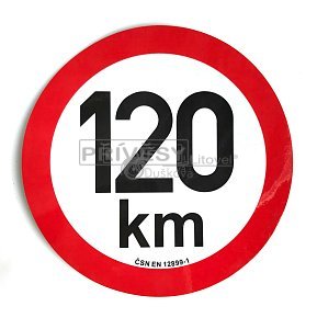 Samolepka průměr 200 mm s označením nejvyšší povolené rychlosti 120 km/h v provedení z retroreflexní fólie třídy 1 dle ČSN EN 12899-1, odpovídající platnému znění vyhlášky 341/2014 Sb. Tam, kde není možné umístit označení nejvyší povolené rychlosti o průměru 200 mm, je nutné umístit označení o průměru 150 mm. Výňatek z vyhlášky 341/2014 Sb. (Příloha 12, odstavec H)) H)Technické požadavky na výbavu vozidel označením nejvyšší povolené rychlosti 1. Vozidla kategorií M2, M3, N2, N3, O, R, S, C, T a Z s výjimkou čelně nesených strojů kategorie SN a jednonápravové traktory s přívěsy a speciální nosiče pracovních adaptérů musí být vybavena na zádi karoserie, a to pokud to konstrukce vozidla dovoluje, v levé polovině označením nejvyšší povolené rychlosti zaokrouhlené a) u vozidel s konstrukční rychlostí nepřevyšující 45 km.h-1 na nejbližší nižší celé číslo, b) u ostatních vozidel na nejblíže nižší celé číslo dělitelné pěti. 2. Označení nejvyšší povolené rychlosti je v provedení kruh bílé barvy, který je lemován červenou barvou o vnějším průměru 200 mm; písmena v kruhu, pokud jsou použita, musí mít výšku „k“ 35 mm, „m“ 24 mm, číslice 75 až 80 mm, tloušťku čáry písmen 6 mm a číslic 12 mm. Barva nápisu je černá. Označení nejvyšší povolené rychlosti musí být vždy čitelné a při provozu nesmí být zakryto. Označení se vyžaduje z retroreflexního materiálu třídy 1 podle ČSN EN 12899-1 tedy červená a bílá, písmena a číslice jsou nereflexní. Retroreflexní materiál se nevyžaduje u vozidel, u kterých je provoz za snížené viditelnosti zakázán, u zvláštních vozidel a nesených strojů. 3. Není-li možno u přípojných vozidel kategorie O1, O2, R, vozidel kategorie S, jednonápravových traktorů s přívěsem a speciálních nosičů pracovních adaptérů umístit označení o průměru 200 mm, je přípustné použít označení o vnějším průměru 150 mm; potom písmena v kruhu, pokud jsou použita, musí mít výšku „k“ 20 mm, „m“ 14 mm, číslice 75 až 80 mm, tloušťka čáry je u písmen 3,5 mm a u číslic 12 mm.