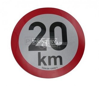Samolepka průměr 200 mm s označením nejvyšší povolené rychlosti 20 km/h v provedení z retroreflexní fólie třídy 1 dle ČSN EN 12899-1, odpovídající platnému znění vyhlášky 341/2014 Sb. Tam, kde není možné umístit označení nejvyší povolené rychlosti o průměru 200 mm, je nutné umístit označení o průměru 150 mm. Výňatek z vyhlášky 341/2014 Sb. (Příloha 12, odstavec H))
