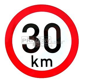 Samolepka průměr 200 mm s označením nejvyšší povolené rychlosti 30 km/h v provedení z retroreflexní fólie třídy 1 dle ČSN EN 12899-1, odpovídající platnému znění vyhlášky 341/2014 Sb. Tam, kde není možné umístit označení nejvyší povolené rychlosti o průměru 200 mm, je nutné umístit označení o průměru 150 mm. Výňatek z vyhlášky 341/2014 Sb. (Příloha 12, odstavec H))