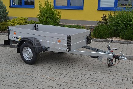 Provedení s "V" ojí, hliníkové bočnice 350 mm, 13" kola, 13pólová elektroinstalace, podlaha je vyrobená z voděodolné překližky o síle 9 mm, 4 ks kotvících ok, opěrné kolečko s držákem, zakládací klíny a zadní LED osvětlení AGADOS SMART.