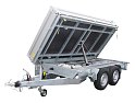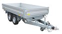 Třístranné sklápění korby, odnímatelné sklopné hliníkové bočnice 350 mm. Celosvařený spodní a horní rám. Provedení s "V" ojí, 13" kola, 13pólová elektroinstalace, podlaha je vyrobená z voděodolné překližky o síle 15 mm. Ruční ovládání hydrauliky, zadní čelo otevírací, přední čelo pevné.