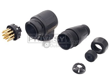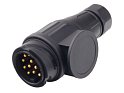 Zástrčka 13-pólová dle ISO 11446. Dodáváno s gumovou průchodkou. Lze použít na elektroinstalace většiny přívěsů. Jednotlivé vodiče se k pinům připojují pomocí šroubků.