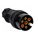 Zástrčka 12V / N, 7 Pinová (ISO 4091, DIN / ISO 1724). Plastový kryt-PP, odolný proti ničivým účinkům počasí. Mosazné kontakty. Šrouby, které upevňují dráty - M3 a samořezné šrouby (ocel) 4x18 Pozinkované (zinek nebo nikl).Vnitřek je vyroben z PVC polviplastu.